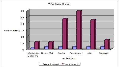 商業(yè)打印領(lǐng)域的焦點(diǎn)在高速寬幅數(shù)碼印刷機(jī),全球只有少數(shù)幾家公司擁有此種技術(shù),市場(chǎng)能見(jiàn)到的主要的機(jī)型有大日本網(wǎng)屏的TruepressJet520,日本宮腰的MJP系列,東京Kikai的Jetreader,惠普的Webpress T300,柯達(dá)的Prosper5000XL等,此類卷紙印刷機(jī)的主要應(yīng)用在直郵、帳單、書報(bào)出版、促銷廣告等方面,以宮腰的MJP20F為例,在1200X1200DPI精度下,速度可達(dá)每分鐘250米,打印幅寬541毫米。