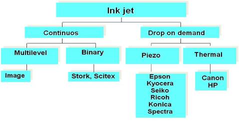 噴墨技術分為連續(xù)噴墨和按需噴墨(DOD)兩種,前者目前只用在柯達的數(shù)字印刷機上,市場上的絕大部分噴墨打印機都屬于按需噴墨技術,按需噴墨又分為壓電和熱發(fā)泡兩類,熱發(fā)泡噴頭廉價、精度高,但其缺點也是顯而易見的:噴頭壽命短、只適用水性墨水,因之主要用于家庭和辦公室的紙張打??;而壓電噴墨是利用陶瓷加上電壓后會變形的原理,直接將電壓轉換為機械壓力,工作在常溫下,也無需溶解在水中的氧氣幫忙,所以不但噴頭壽命長,而且可以適用各種類型溶劑所生產(chǎn)的墨水。