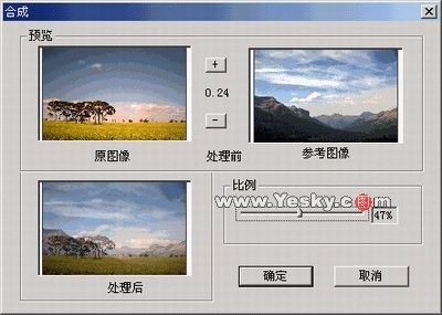 在“特效處理”中可給照片加入各種特殊效果,如圖片合成、美術(shù)效果、狀態(tài)效果、透視效果和將BMP圖象轉(zhuǎn)換為文本等,例如要將圖片合成,可打開兩幅照片,然后單擊“圖片合成”子菜單,將彈出合成預(yù)覽框。預(yù)覽框中提供了原圖象和參考合成圖象,以及合成后圖象的預(yù)覽,可通過調(diào)節(jié)滑桿來調(diào)節(jié)原圖象在合成后圖象中所占的比例,便捷好用。