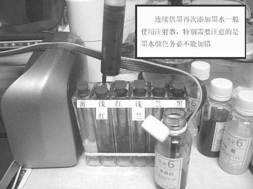 3.打印機使用連續(xù)供墨系統(tǒng)以后的日常保養(yǎng)工作不可忽視以下幾點:①打印機擺放位置不能被日光直接照射,同樣,外墨盒盡量不要長期被紫外線照射,以免外墨盒墨水保存時間縮短,如果受使用條件的限制,可以將外墨盒做遮光處理或者選用外墨盒有防紫外線盒子的連續(xù)供墨。②外墨盒上都有通氣孔,打印機的使用環(huán)境就需要注意防塵工作。③打印機不能長期不使用。噴頭在打印中是否有斷線,與氣候、環(huán)境、墨水質(zhì)量、自身狀況等都有關(guān)系,最好每半個月至少使用1次,氣候特別干燥的地區(qū)每周至少使用1次,如確實無打印任務(wù),可以打開打印機電源后,打印一張噴嘴檢查圖以便確定噴嘴狀況。④外墨盒再次添加墨水方法按照說明書操作即可,需要注意的是打印機外墨盒的墨水最好不要使用一點就馬上添加,墨水存放有一個保質(zhì)期,每色使用到一定極限再添加為好;添加墨水的時候也要注意不要加得過滿,更不能添加錯顏色(圖14)。⑤不同牌子的墨水不要混用,如果要換其他牌子墨水,應(yīng)將外墨盒中的墨水抽干后再更換,顏料墨水和染料墨水之間需要互換,應(yīng)當(dāng)先將整個連續(xù)供墨系統(tǒng)的墨水都抽干凈并進行清洗。