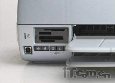 對(duì)于照片打印機(jī)來(lái)說(shuō),最重要就是它一般都設(shè)計(jì)內(nèi)置了數(shù)據(jù)讀卡單元,能夠在不連接計(jì)算機(jī)的情況下,可直接讀取數(shù)碼相機(jī)存儲(chǔ)卡中的照片數(shù)據(jù)并進(jìn)行打印??梢詮膱D中看到,在Photosmart 7268前面板上提供的一組存儲(chǔ)卡插槽,這一組存儲(chǔ)卡插槽,能夠直接讀取CompactFlash、SmartMedia、Secure Digital、多媒體卡以及記憶棒等主流類型的存儲(chǔ)介質(zhì)。另外在插槽旁邊也提供了提供了打印10×15cm照片和打印照片拼頁(yè)的按鍵,接讀取數(shù)碼相機(jī)存儲(chǔ)卡中的照片數(shù)據(jù)并進(jìn)行打印。